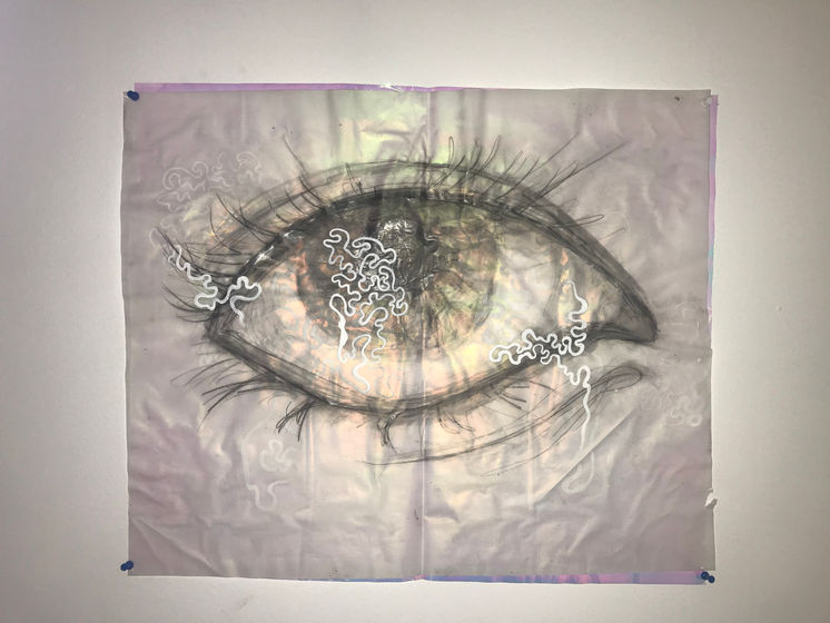Playing with the color in an intuitive way, such as exaggerating the saturation, in order to keep the reality of my symbol as loose as possible while still pushing the boundaries of what is recognizable, while also letting the medium dictate the direction of the piece through trial and error. With the example of “Untitled 2” a soft effect was created due to graphite interacting with the smooth surface of the tracing paper it was illustrated on. The iridescent bouquet wrapping paper overlaid on top led to the experimentation with light interacting with the piece and how that affected the image.